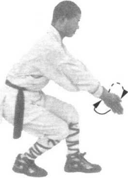 先抬左脚,后抬右脚,向右转身(360度)跳 步。转身后左脚在前,右脚在后,两腿半蹲。同时 两拳变掌,由上向外再由外向腹前下方合击(响 亮)。目视两手(图25)。
