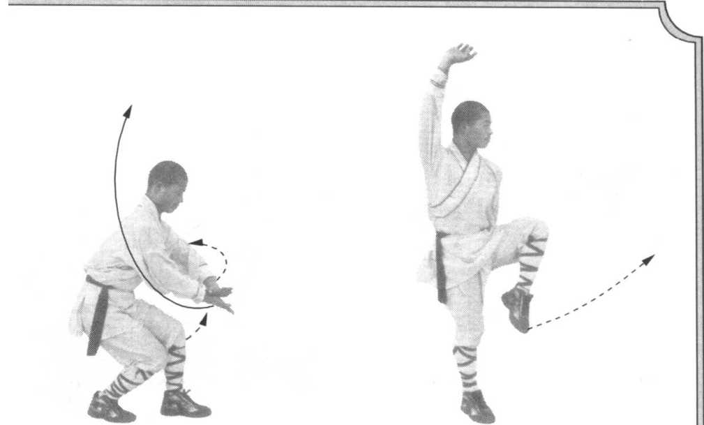 接上动作,右脚不 动,抬左腿向前提膝。同 时左掌向左侧下方劈按, 右掌举臂上架头上右侧。 目视前方(图27)。