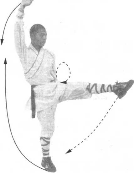 图28图28——右脚不动,抬左脚 向前弹踢,右手上举, 目视左脚(图28)。