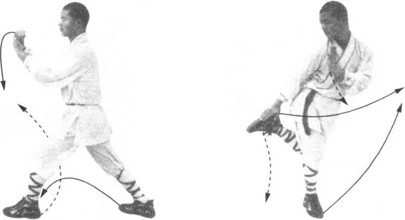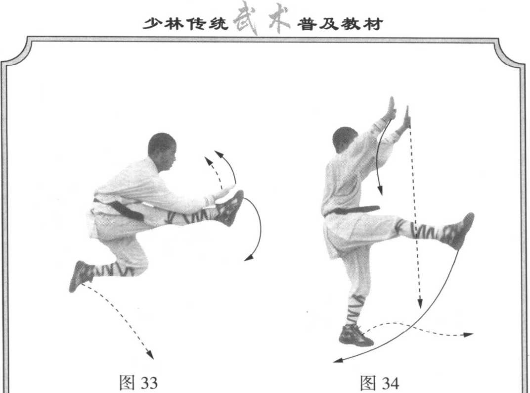 接上式,体左转90度,左脚不落地,抬右脚 向前、向上弹踢。当全身腾空时,出右手向前拍击 右脚面(响亮);左掌变拳抱于腰间。目视右手 (图 33 )。
