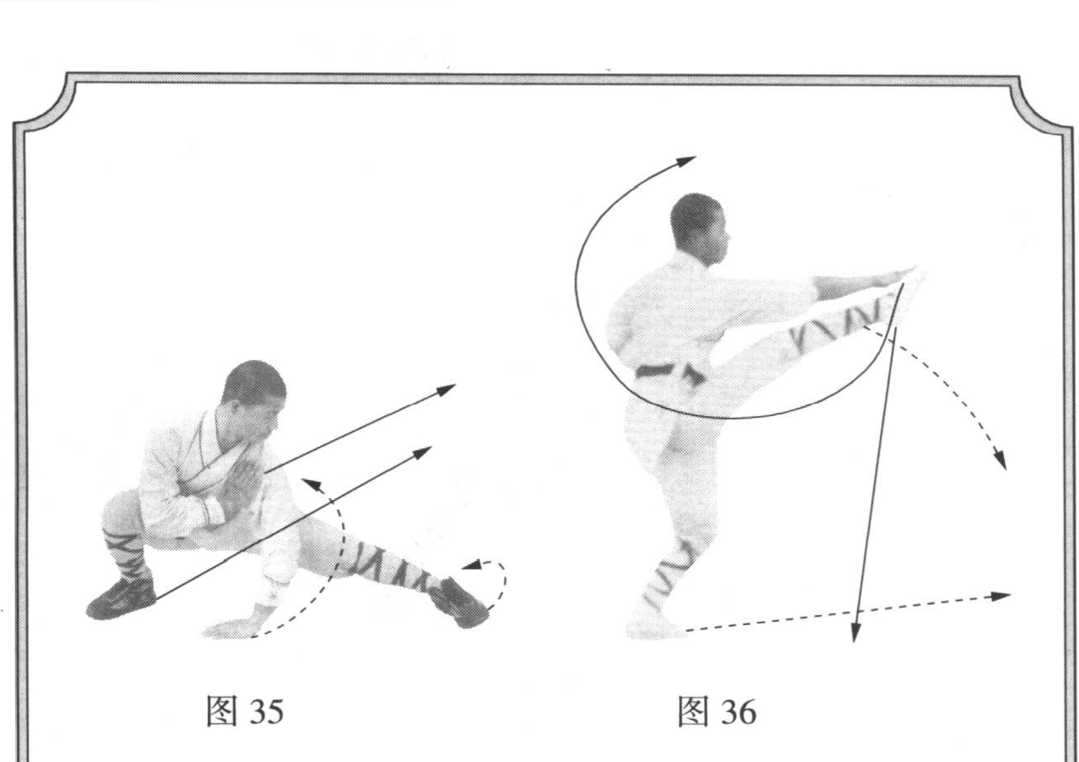 接上式,左脚落地后,右腿微沉,快速向右摆 .弹,同时出两手由右往左拍击右脚面(响亮)。目 视前方(图34 )。