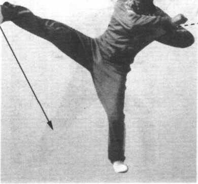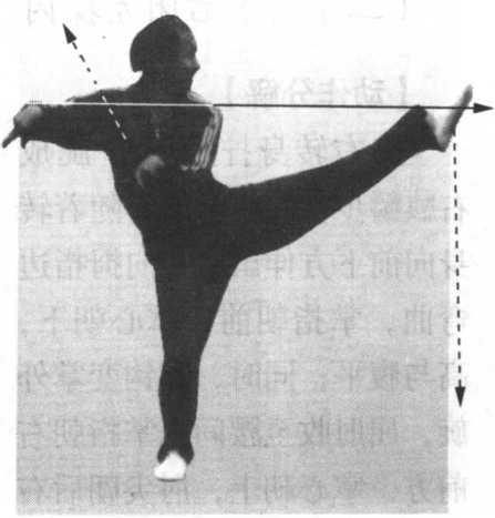 尖朝下,右钩在后,高与肩平; 紧接着右脚震脚落地,同时向 左转身180。,左脚面朝上绷. 直,脚尖朝前,随着转身向前 上方踢起,高与腹平;目视左 脚(图4-6-46 )。