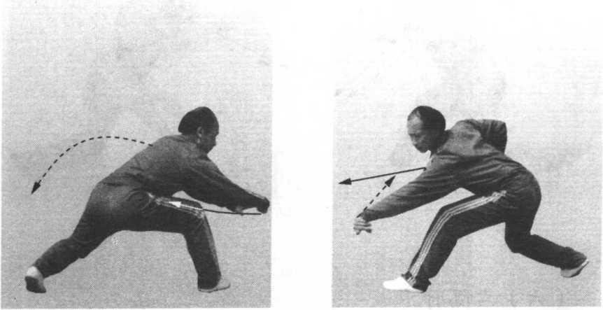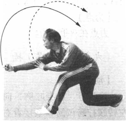 2 .接上动。向左转腰拧胯调膀;右拳内旋,随着转腰调 膀向前下方冲出,拳面朝前,拳心朝左,高与小腹平;同时,