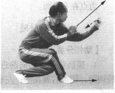接前势。向右转身180。,吞胸塌腰,双腿全蹲,腿成右坐盘
