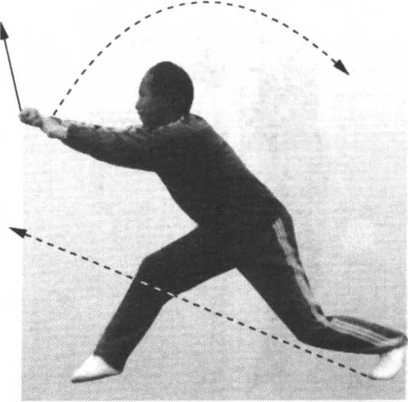 3 .接上动。右脚向前落地,成右麒麟步,紧接着吞胸塌 腰,身向前探;右钩变掌,腕向拇指边弯曲,掌指朝上,随着