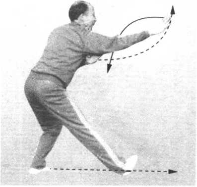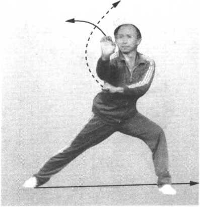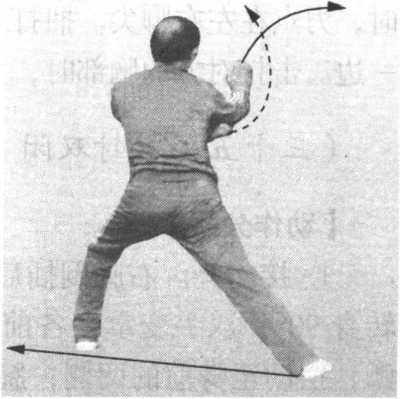 3 .左脚倒插上一步,成右麻花步,随之向右转腰调膀; 左掌内旋,从右臂下方直臂向前上方划弧,摆动至身前左侧变