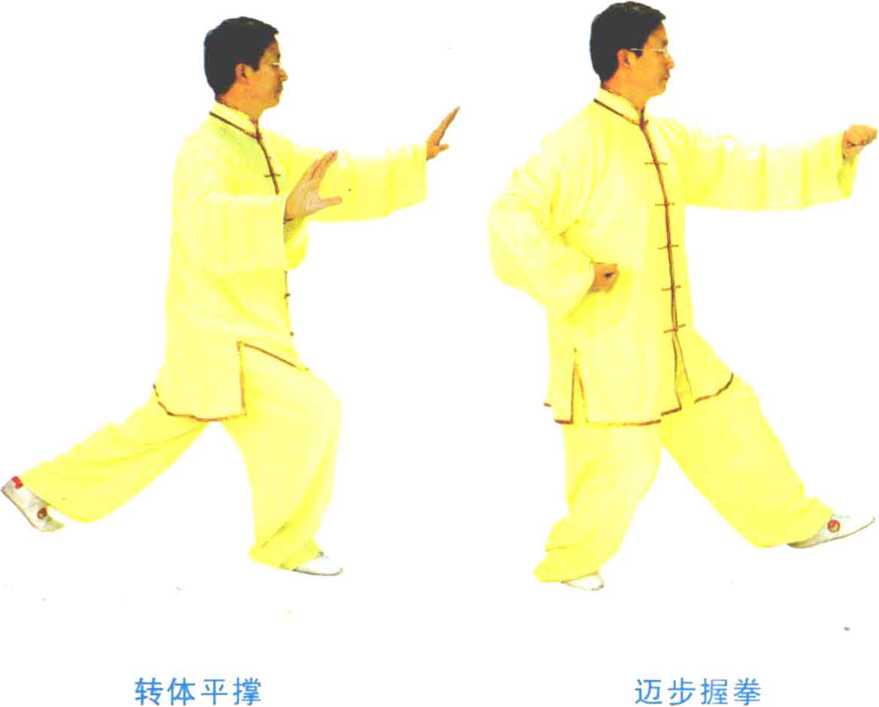 练习方法:向右转体,右脚尖外展45度,重心于右腿,左脚 提起向前迈出,脚跟先着地;左勾手变掌,随体转双掌平展,然 后右掌握拳向右划弧收于右腰间,拳心向上;左手向右拦掌握拳 于体前,拳心向下,眼随体转向前平视。