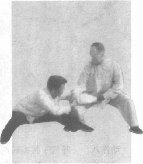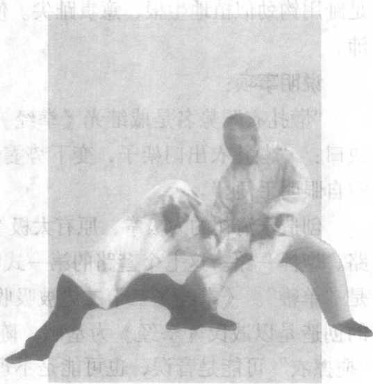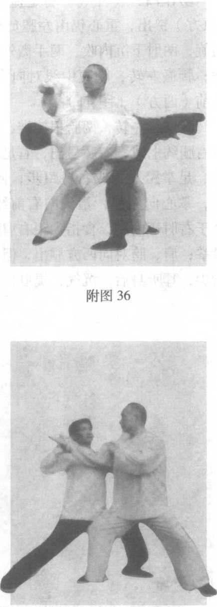 名指天划地,上护头, 下护裆。假定对方用右顺 步拳击我,我右手采其前 臂,蹲身进步,左掌下撩 其裆部。随即腰右转,图 37-39,右手向右后采,左 手顺势撩起其前腿向上、 向右后翻,腰腿身手螺旋 形协调,把对方摔跌。乘 势借力、螺旋、抖劲为要 诀(附图36 )o