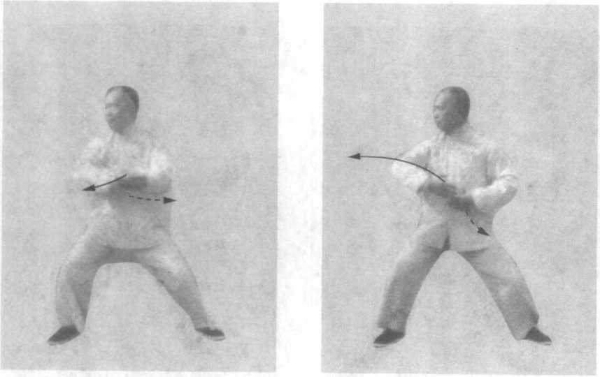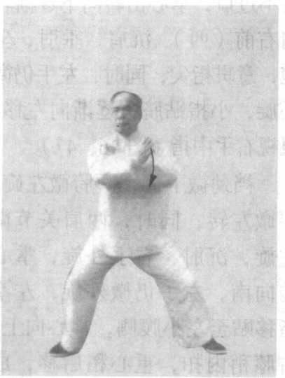 掌心俱向内,指上扬,左拇 指对向锁骨中线约三横拳, 渐渐沉肘双手下落至胃部 前;重心渐渐左移,成骑马 步(外八字桩步),两腿平 均负担体重,桩步似植地生 根,胸腹中线向正南,项右 转;眼光平移视西方(图 43、44 )o