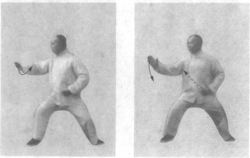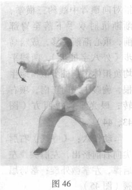 右手内旋向右前划弧展开, 高不过口,掌心由转向下逐渐转 向右前(西),沉肩、垂肘、坐 腕,意贯指尖;同时,左手仍微 外旋,小指贴脐下逐渐向左移; 眼视右手中指(图46、47 )o