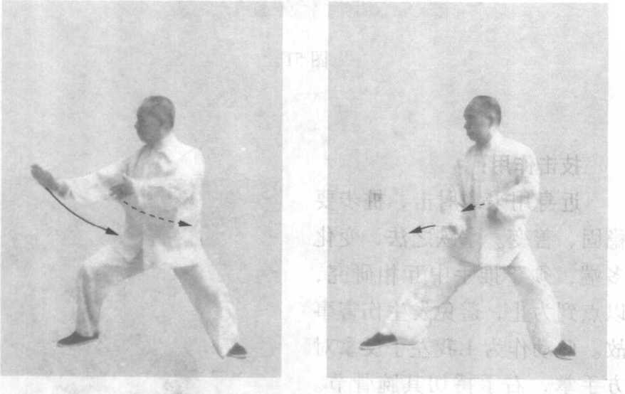 腰微左转约15。,身后坐,成左实右虚的丁八步;两手左采 右捋至两腹侧,左手高于右手,左手采至左腹侧,五指向内上 勾,虎口贴腹,掌心向左内;右手捋至右小腹,前臂内侧贴腹, 掌心向左前,指尖向右前(图50)。