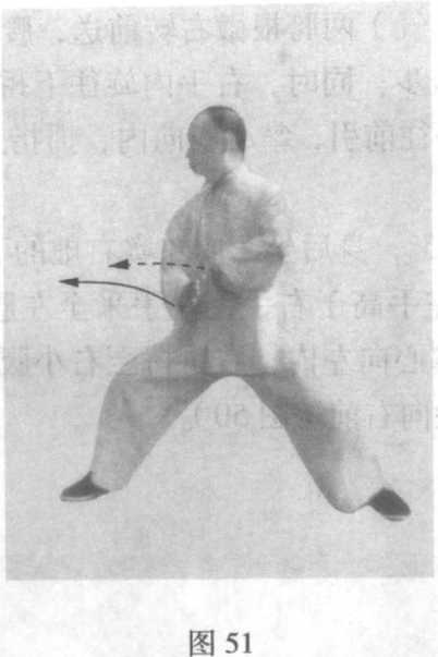 动作七:(吸气)两胯根微右转前送,腰微右转约30。,右 膝前弓,成右弓蹬步;同时,右手内旋往下捋回,劲点在掌缘, 掌心向前下;左手往前引,掌心斜向内,拇指上扬,劲点在掌缘 (图 49 )o