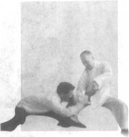 1 .进身靠打。图40?42 假定对方双手按我右臂, 我转腰旋臂向右前伸,用 搠劲化开来力,同时进右 步插对方裆中,腰左转, 弓右腿,肩靠对方胸部, 胯打对方裆部,身正直不 偏。柔过劲、刚落点、贴 身一抖为要诀(附图42 )o