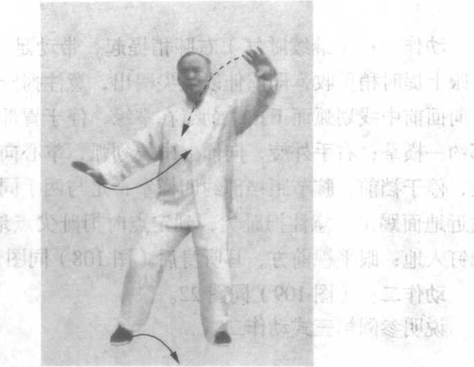 往右后划圆扫转约180。,左足尖随着再内扣,重心仍在左腿; 右手随着展开向水平线划弧,手与肩平,肘低于手,劲点在掌 缘;眼平移视右前,耳听身后(图1。5 )0 .