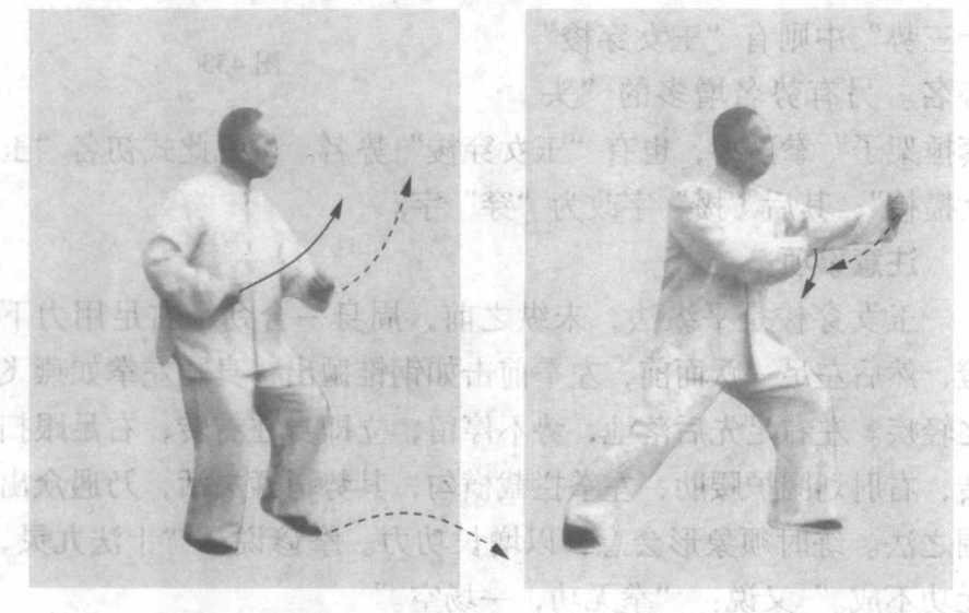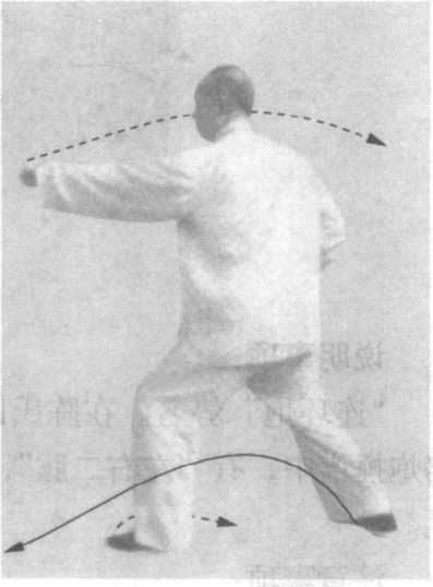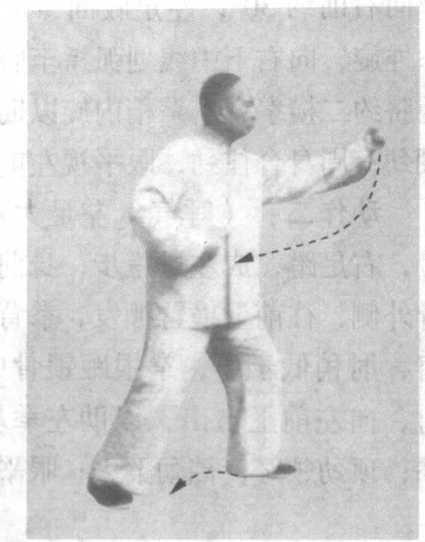上动不停。右足跟用意 贯劲,足掌轻贴地,劲点在 足跟,往右后扫转180° (半圈),至左足后方,腰右 转,左足尖随着往里扣,身 由北向南,成左腿前弓,右 足后蹬,两足足跟站在一条 直线上;同时,右肘随转身 向右后划半个圆圈,以防 护、拦截身后(右侧)来 拳,仍收回至右肋前,拳心 向上;左拳外旋,劲点在尺 骨处,随转身向右侧水平线 划弧,拳心向右内上,尺骨 处管住胸前中线,下与左足
