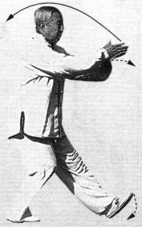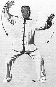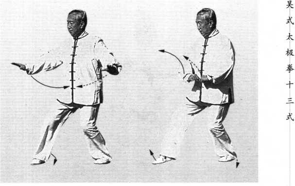 要点:右掌挑起肩为轴,左掌内旋向前伸; 掌心相对与肩平,左膝提起前进步。