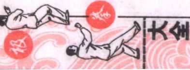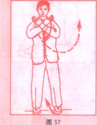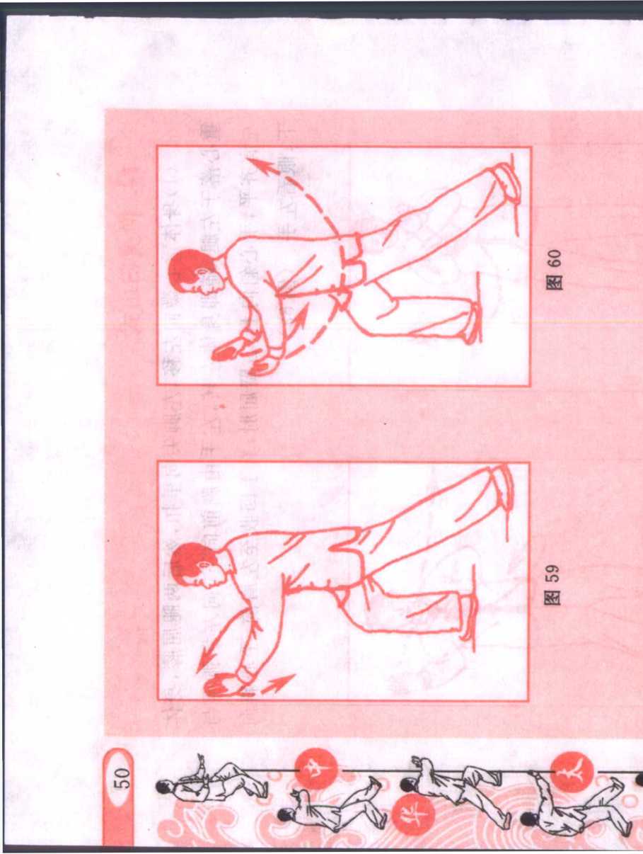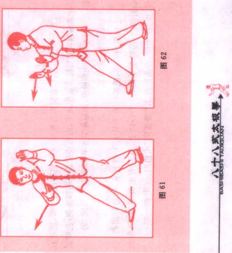 (1)身体重心微向左移,左脚尖向里扣,然后两腿屈膝,身体 重心落于左腿,随即身体左转,左手由胸前向下、向左划弧至与 左肩齐平,手心斜向上;右臂屈肘,右手回收至左肩前,手心斜向 下;眼看左手。(图58)