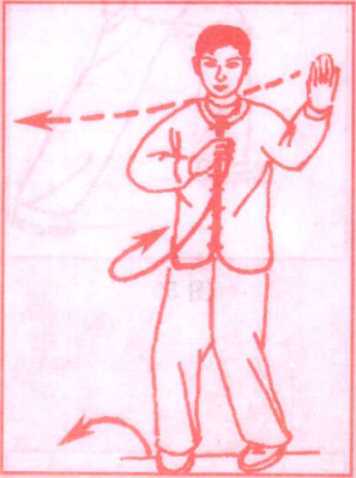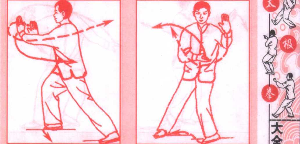 (1)上体后坐,身体重心慢慢移至左脚,右脚尖里扣同时上 体左转,两手(左高右低)向左弧形运转,直至左臂平举于左侧,