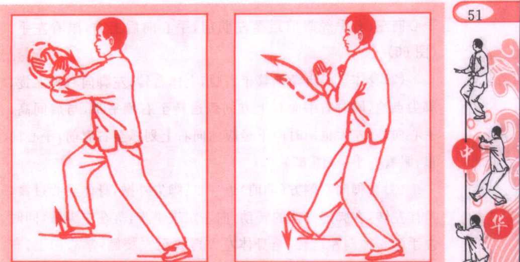 t >a.^上体微向右转,随转体右手从右下侧上举,约与肩同高,手 心斜向内;同时左手翻转,手心向上,落至右前臂下方;然后做 捋、挤、按动作,方法同前3.“揽雀尾”式相同。(图60?65)