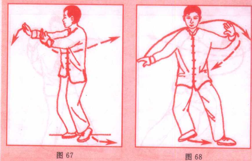 (3) 左脚向左侧方(偏前)迈一步,脚尖外撇,身体重心过渡, 身体左转,右脚随身体的转动,向左跟进半步,落在左脚后,同时 左手随转体向左运转,至身体左方再收至左腰侧,掌心向上,右 臂也随转体左划弧运转于胸前;眼看前方。(图68、69)