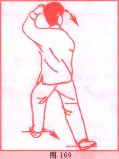 (2) 左腿提膝,左脚向左侧方迈一步,同时身体左后转,左腿 屈膝成左弓步;同时,两手一齐向腹前下落,右手变拳停于左胸前 (拳心向下),左手变拳由下向上划弧,停在左额上方(拳心向下), 两拳背上下斜对;视线随转而移动,然后平视右前方。(图169)