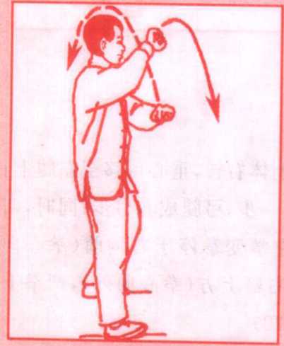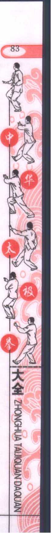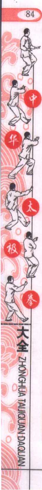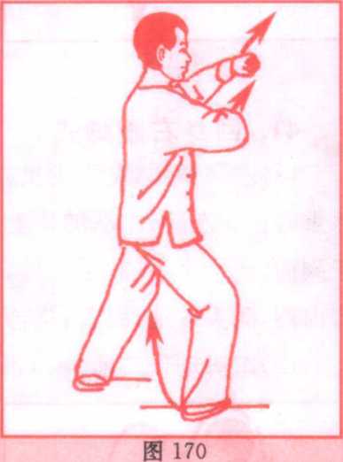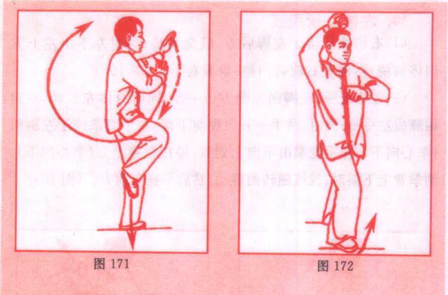 身体重心后移,左脚尖里扣,上体右转,重心再移至左腿上; 随即右膝提起,右脚向右侧方迈出一步,弓腿成右弓步;同时,两 拳变掌下落经腹前向右边划弧,左掌变拳停于右胸前(拳心向 下),右掌变拳经身体右侧上举于右额上方(拳心向外),两拳上 下相对;眼看左前方。(图170?172)