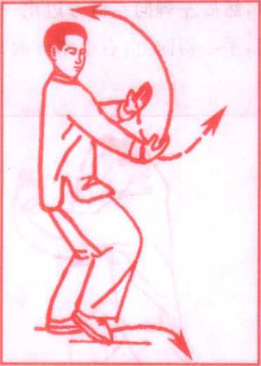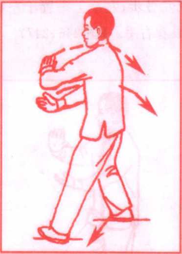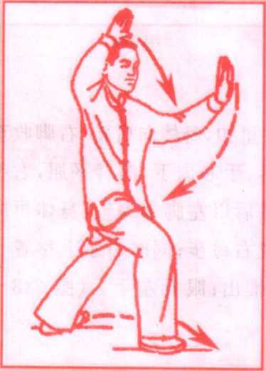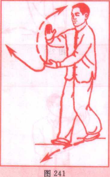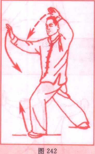 (1)身体重心略向后移,左脚尖里扣,身体重心又移于左脚, 右脚掌为轴脚跟内转,身体随之向右后转,两腿扭转成半坐盘 势;同时,右手变掌右臂收至胸前平屈,手心向下,左手由左向下 划弧停在腹前,手心向上,两手心相对成抱球状;然后左脚向左 前方迈出一步,成左弓步,左手由脸前翻掌向上举起,置于左额 前,手心斜向上,右手则向前方推出,高与鼻尖平;眼看右手。 (图 240?242)