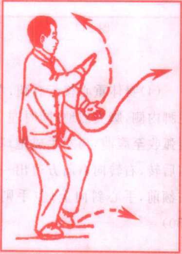 (2)身体重心移于右腿,左脚尖里扣,身体向右后转,身体重 心再移至左腿,右脚收至左脚里侧,前脚掌着地;同时左手下落 平屈于胸前,右手下落在腹前,手心向上,与左手相对成抱球状, 然后左脚掌为轴,身体再向右后转,右脚向右前方迈出一步,弓 腿成右弓步;右手上举置于右额前,手心斜向上,左手则向前推 出;眼看左手。(图243?245)
