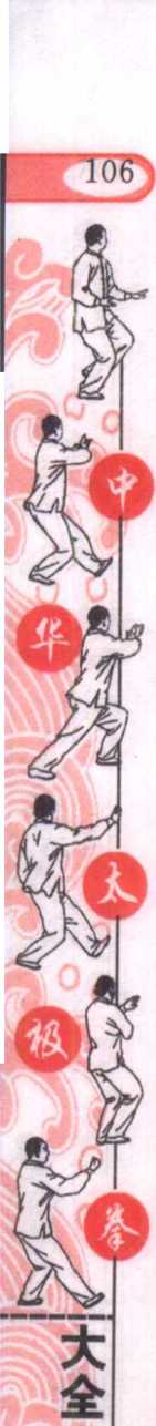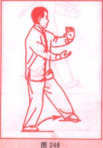 (3) 图243图245图244图246身体重心稍向后移,右脚尖微外撇,随之身体重心又移 至右腿,左脚进至右腿内侧。脚尖点地;左手划弧收至腹前,手