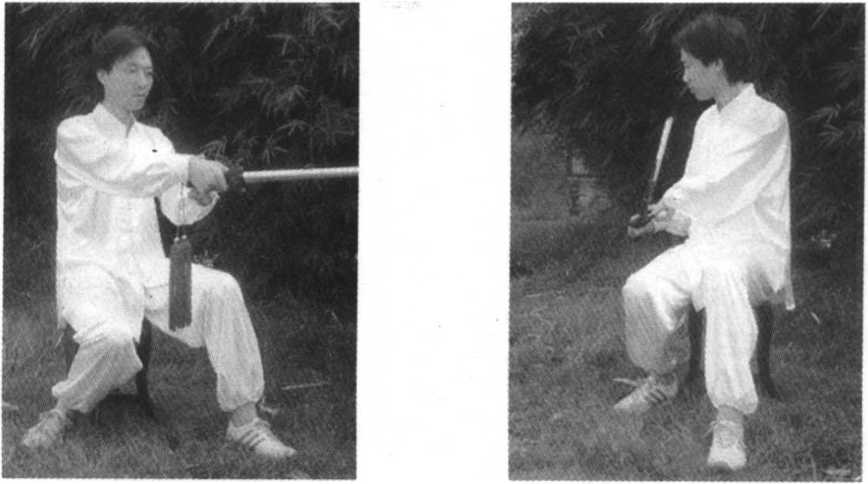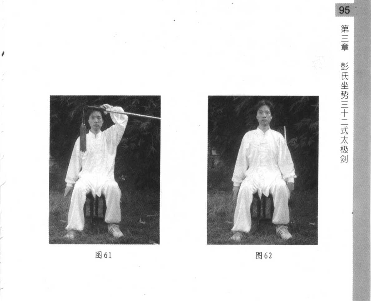 2. 身体左转,身体重心再移到左腿,右脚向前跟进 半步,与左脚成开立步(与肩同宽,脚尖向前),同时左 手接剑(反握),经体前下落垂于身体左侧,右手变成剑 指向下,向右后方划弧上举,再向前,向下落于身体右 侧;全身放松;眼平视前方(图61图62)。