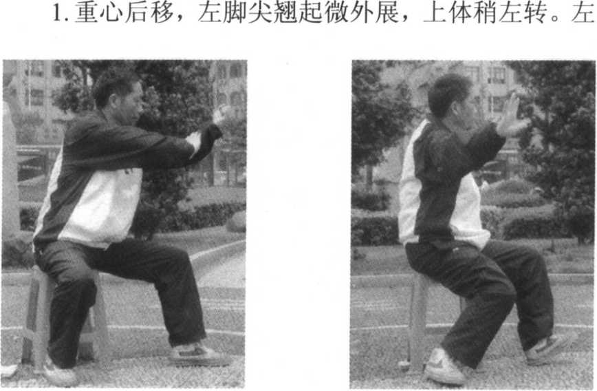 1. 重心后移,右脚内扣,上体左转。同时右拳变掌, 掌心斜向上,收于胸前,左拳变掌,掌心斜向下,从右 前臂上向前穿出,眼向前看(图82)。