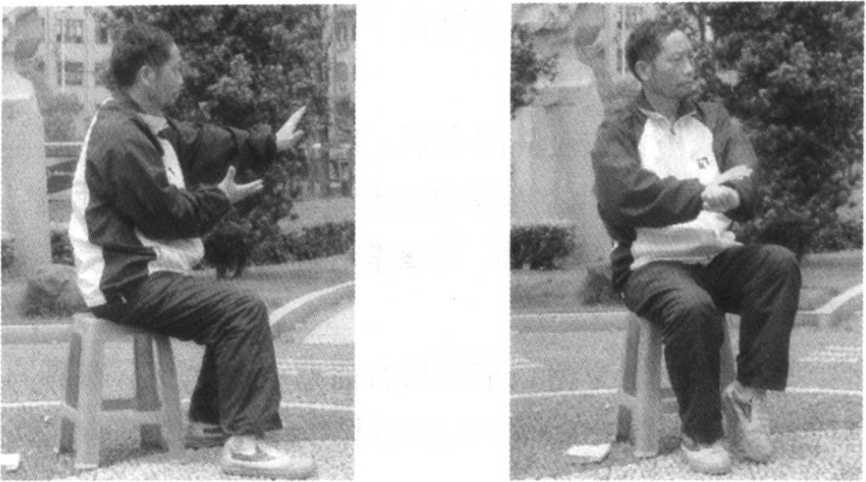 拳变掌向上向左划弧,右掌向下向右划弧,两掌心皆向 下,眼看左掌(图86)。