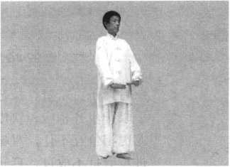 身体成立正姿势,面 对前方向右45°,两臂自然 .下垂位于身体两侧,成八 字掌。精神集中,扣齿闭 唇,气沉丹田。目视前方 (图 3-16-1)。