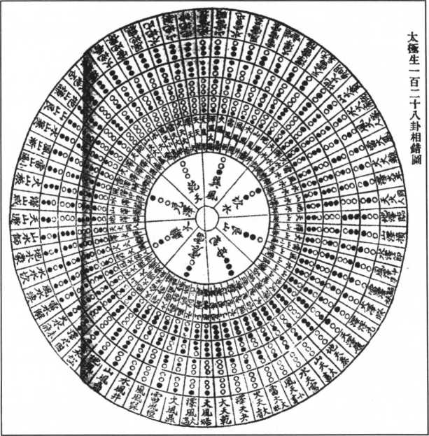 《太极生一百二十八卦相错图》是与前面的《六十四卦颠倒相 综图》不同之处,就是它是把两个六十四卦,即一百二十八卦进行 排列组合,从而找出了每两个卦相对的关系。并且在不同程度上把 这一百二十八卦所组成的圆进行分割的情况下找出了每一圈中阴爻 与阳爻数目的规律。