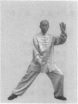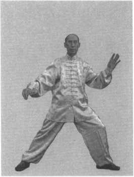 图 8-115图 8-115接上式。单鞭势成后,先将右钩手变掌,下落内旋,经胯、 裆、衣扣、鼻、眉处,继而外旋;重心同时倒至右腿,右脚向右 抹摆45。;左掌领肘带臂下旋内转护裆,同时沿衣扣直上至眉向 左外旋下划弧成一圈;重心移至左腿,左脚向左抹摆45。;此 时,右掌领肘带臂,经胯、裆、衣扣、鼻、眉处向右外旋,重心 转至右腿,右脚抹摆45。;而左掌亦同转至左腿;左脚随重心转 换向左抹摆45。;左右两掌领上肢各划循环圈两次即成云手一 式。云手时不要扭腰转身,重心的转换如座钟摆动一样。两腿均 成弓蹬步,脚跟为轴,随手的方向来回抹摆。两手划圈时注意松 肩活胯,使旋转轻灵圆活。在发挥技击作用时,可以增强左右旋 转缠绕的功能和速度。在云手第四下时向右转90。(图8-116~图 8-119)。