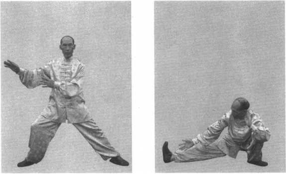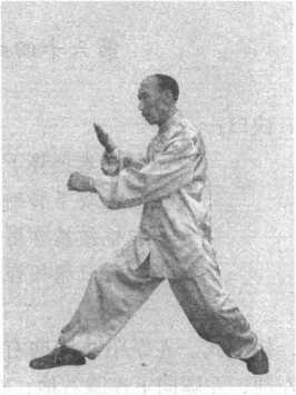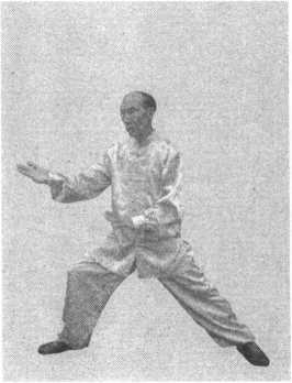 接着右掌向前往上托起; 右脚着地长起;左掌亦同时由 耳后向下右侧下按;重心移至 右腿,成右弓左蹬步(图8- 272、图 8-273 )。