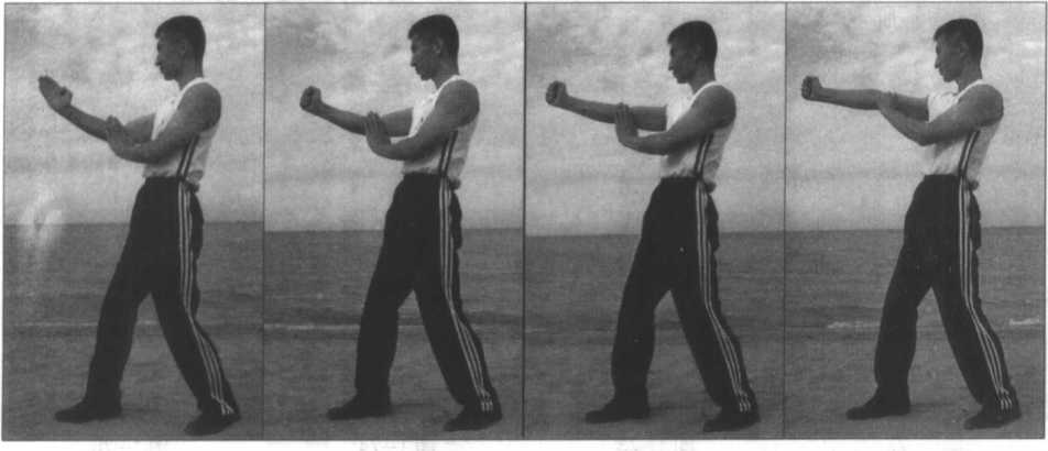 (图1-76、77、78、79)为拗步“左曰字冲拳”的侧面示范。此时右手是护于左 肘上的,用以严密地屏护自己。