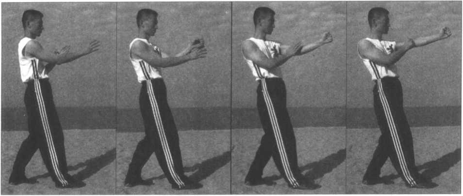 (图1-64、65、66、67)为顺步“右曰字冲拳”的侧面示范。此时左手是护于右 肘上的,用以严密的摒护自己,全身的动作要自然、敏捷,不可僵硬。