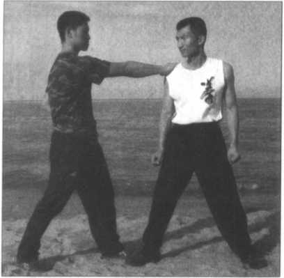 第二、在这里,我右拳虽不是由“中线”打出,但也一定要在脚下动作及转腰动 作的配合下强劲地打出,仍以整体的劲力去突然重创对手的致命要害处。
