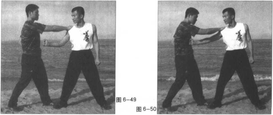 在实战格斗中,当对手从我身体右侧 用右手搭住我右肩时(图6-48),