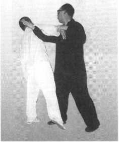 左手拨开前面的干扰,然后用右肩贴近对方胸肋部之后,马上回头, 两眼注视对手。这时,右肩自然产生出很大的劲而使对方接触后跌出(图 112、图 113)。