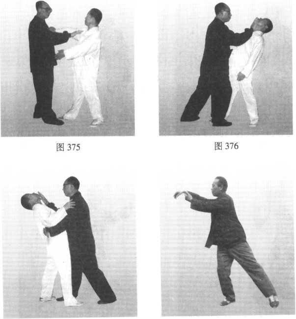 如对方以右掌向我面部打来,我以右掌刁其右手腕,同时向右略微一侧 身,进左步锁其右腿(图378、图379、图380)。
