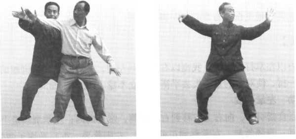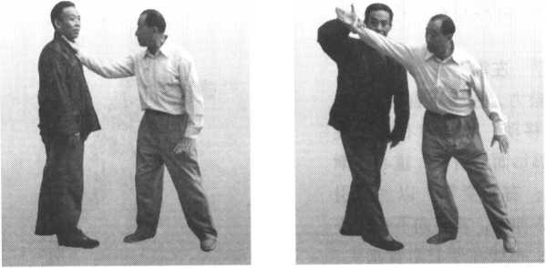接上动。我右手刁住对方右手 腕和进左步锁住其后腿,同时左肩 发松,左肘下沉,左掌向对方面部 或肋下按出,并屈膝略蹲成马步, 将对方发出(图382 )。