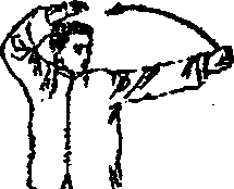 1 .身体重心提起,上体稍向左转,同时,右拳由顶肘向 下直臂下垂至身体左侧,左拳由体后方屈肘上抬至头上方 架起,拳心朝上,目视左拳。(见图3-151)