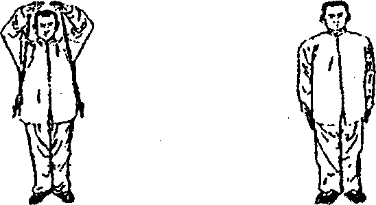 2.左脚向右脚并拢站立,右掌经右胸由下向上绕环再 抢至头上方,左拳由左侧向上屈肘至头上方亮掌,左右两 掌掌心朝下,然后双手慢慢由上至下按在身体两侧。(见 下图)