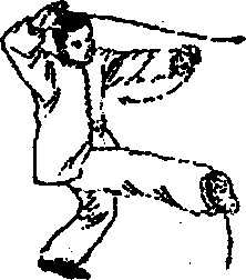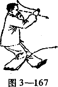 2 .左掌由前方屈肘上挑至左侧头部,掌心朝内,掌指 朝上。高度不超于头部,右掌由头右侧向左侧斜砍。掌心 朝内,掌指朝上,高度不超于胸下。同时右腿屈膝稍蹲,重 心落在右腿上。左腿由后向前脚掌勾起,脚跟擦地丁踢, 目视右掌。(见图3—167)