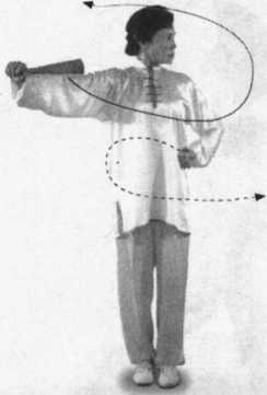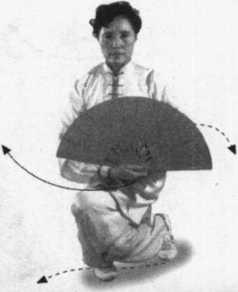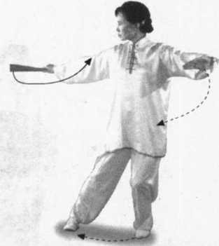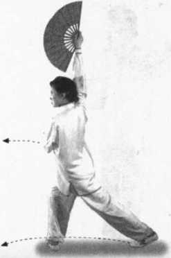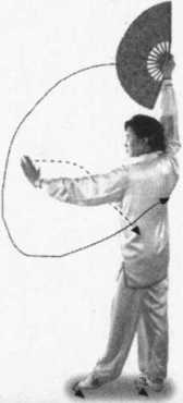 1 .转身挑扇:右腿直立,身体左转。右手持扇向前、向上挑举至头侧上方, 右臂伸直;左掌收至胸前。目视前(西)方。(图54)