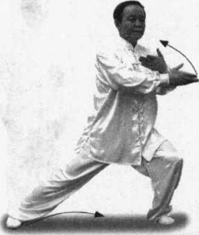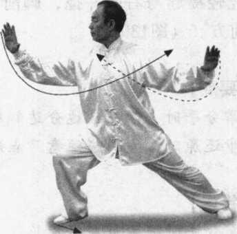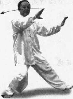 ① 此势的手、腰转动和重心移动幅度比较大,同时配合两脚的扣转、外撇 和收并。整个动作要保持平稳连贯,完整一气,中途不要断劲。