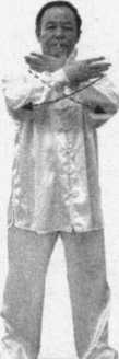 上体转正;右脚轻轻向左收回半步,随之全脚踏实,两腿慢慢直立,体重平 均放于两腿,两脚平行向前,与肩同宽,成开立步;两手交叉合抱于体前,两臂 撑圆,两腕交搭成斜十字形,高与肩平;眼平视前方。(图136)