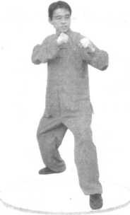 身形向右侧立,45。倾斜; 两手伸出,左前右后,左长右 短。手形为拳,腕骨微挺,拳 心向下,拳眼向里,拳面向 上。沉肩翘肘,臂节适屈,前 后适距,双拳一线,正对前 方,高不过鼻,低不过心;左 腿在前,右腿在后,膝节适 屈,前后适距,成左势蹲山